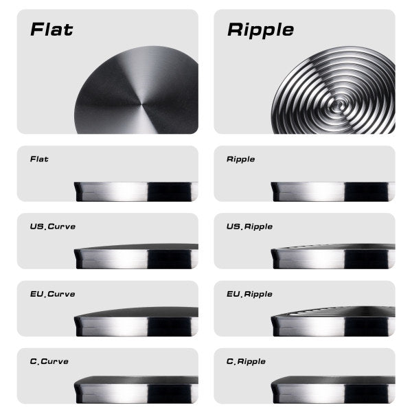Multi-Base Configuration Options: Flat base, concentric circle base, American arc, and European arc profiles available—enabling tamping surface customization matched to extraction preference and basket geometry.