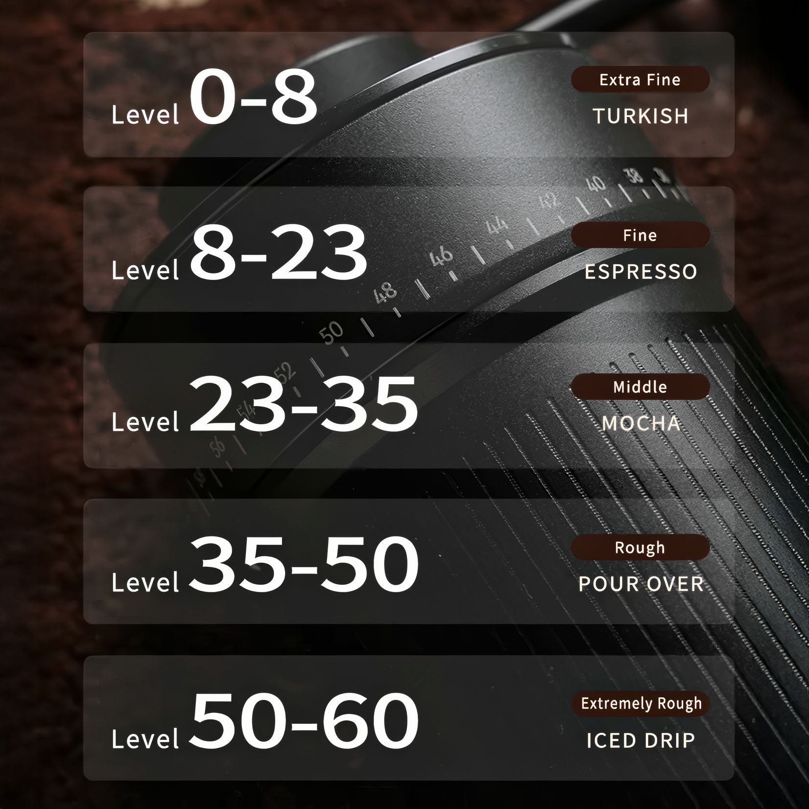 60-Level Even Grinding: Wide 60-stage adjustment range supports all brewing methods from fine espresso to coarse French press.
