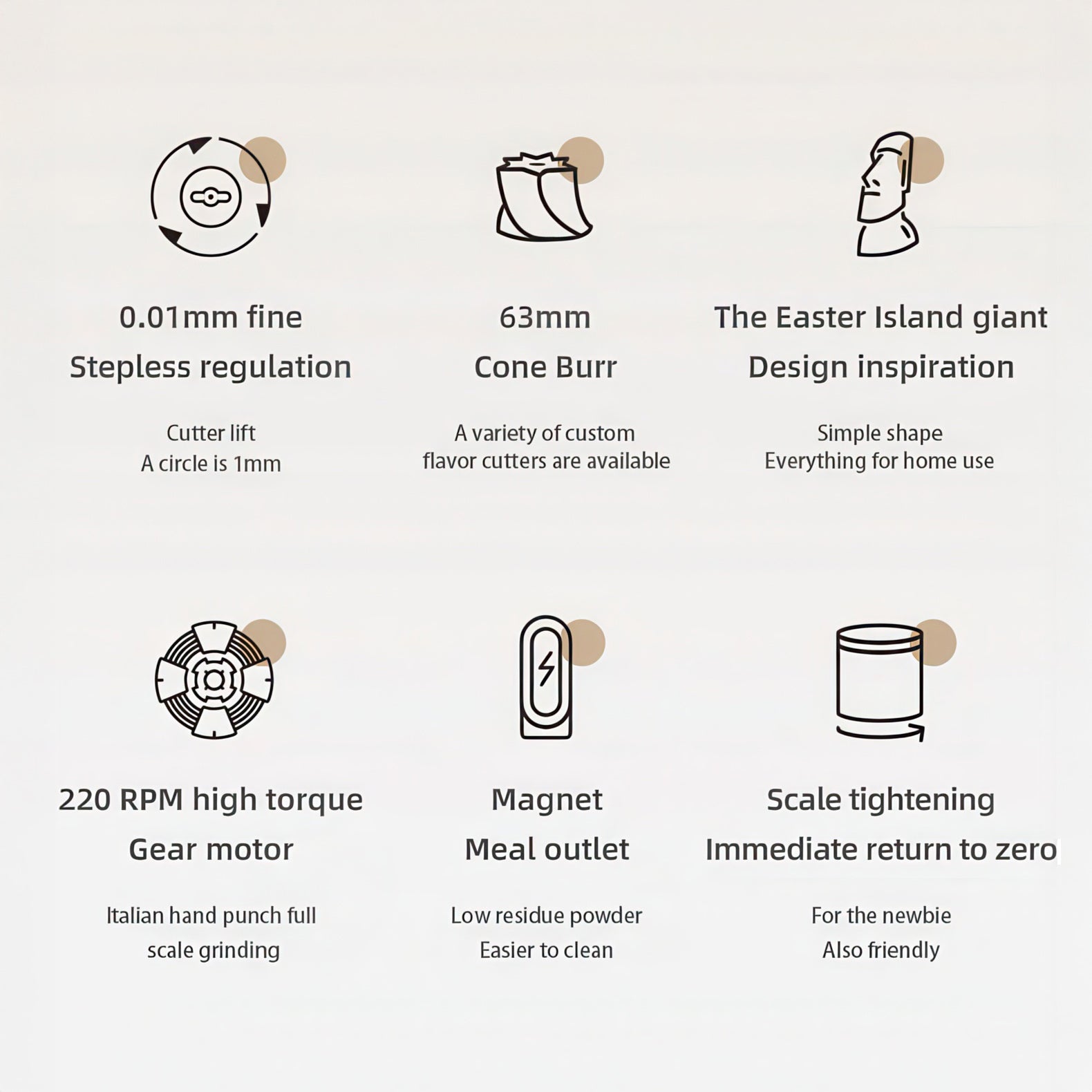 • Plasma Generator Anti-Static System: Built-in plasma device eliminates static, prevents flying grounds, and keeps the grinder clean with minimal residue.