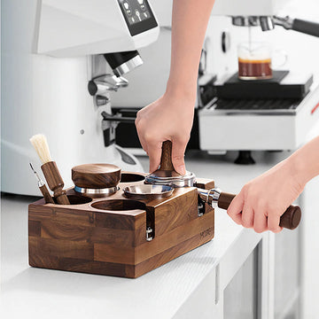 Keep your barista tools organized with our Walnut Coffee Organizer Box. This wooden stand has dedicated slots for your essential brewing tools like filters, tampers, portafilters, dosing rings, and distributors, helping you maintain a tidy workspace.